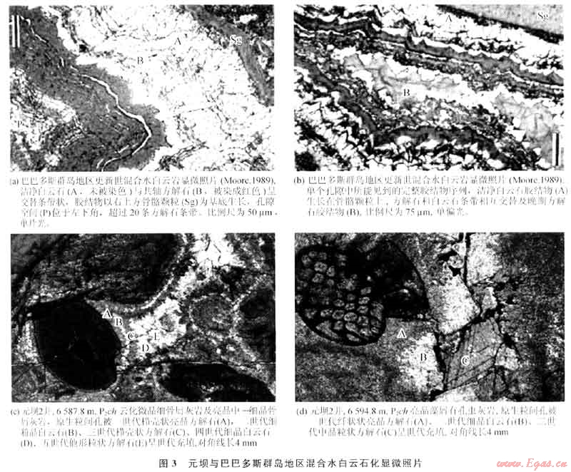 通過(guò)對(duì)比分析巴巴多斯群島更新世碳酸鹽巖混合水白云石化的情況(圖3~a,b)[5],發(fā)現(xiàn)元壩地區(qū)長(zhǎng)興組生屑灰?guī)r混合水白云石化(圖3-c,d)與其有很大的相似性:①白云石膠結(jié)物的量較低并且分布不連續(xù);②白云石膠結(jié)物經(jīng)常作為幾個(gè)不連續(xù)的透明白云石膠結(jié)物帶出現(xiàn),且被夾于透明方解石膠結(jié)物之間;③白云石干凈、明亮,方解石膠結(jié)物晶體形態(tài)從纖狀、粒狀、粉晶、中晶、巨晶不等,各期次膠結(jié)特征是晶體依次增大;④沉淀白云石膠結(jié)物的水體有很寬的組分范圍,根據(jù)電子探針對(duì)長(zhǎng)興組白云巖微量元素分析,Sr0、Na20、K2O表現(xiàn)為較低值,說(shuō)明大部分白云石形成有淡水的加入[6](表1)。
