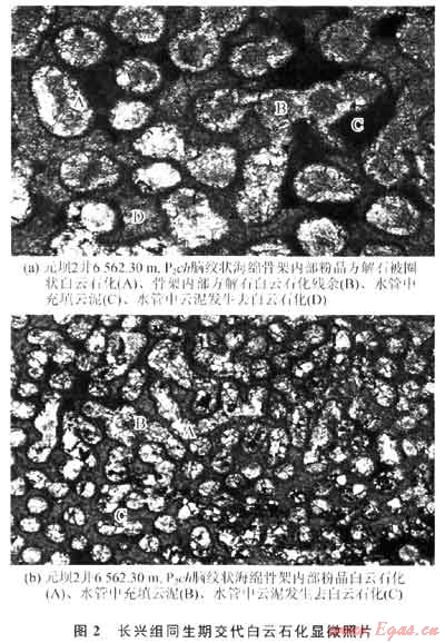 同生期成巖階段交代白云石化作用與沉積同時(shí)發(fā)生,白云石化作用受沉積微相控制,長(zhǎng)興組沉積晚期由于沉積微相差異,元壩2井、元壩101井、元壩102井區(qū)處于臺(tái)地邊緣局限漏湖沉積微相環(huán)境,發(fā)生的混合水白云石化作用較強(qiáng),發(fā)育了一套同生期交代白云巖;而處在斜坡、陸棚沉積區(qū)的元壩4井區(qū),由于缺乏白云石化作用的環(huán)境[7~9],白云石化作用較弱,白云巖層不發(fā)育。同生期發(fā)生的白云石化和主要在同生期發(fā)生的混合水白云石化對(duì)長(zhǎng)興組碳酸鹽巖儲(chǔ)層的發(fā)育具有重要意義。