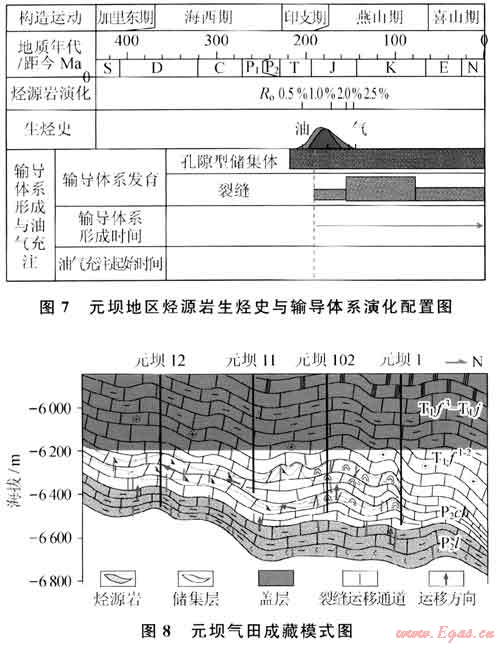 晚印支期,上二疊統(tǒng)龍?zhí)督M烴源巖進(jìn)入生油門限,此時(shí)元壩地區(qū)構(gòu)造活動(dòng)微弱,沒有形成油氣垂向運(yùn)移通道。早燕山期,龍?zhí)督M烴源巖進(jìn)入生油高峰早期,受盆緣造山作用擠壓影響,該區(qū)發(fā)育了構(gòu)造節(jié)理,垂向上溝通龍?zhí)督M源巖,長(zhǎng)興組礁灘相儲(chǔ)層與裂縫構(gòu)成油氣垂向輸導(dǎo)與側(cè)向匯聚的輸導(dǎo)體系,使得原油得以在長(zhǎng)興組聚集形成巖性油藏(圖7、8)。中燕山期(距今約150Ma)以來,受盆緣造山作用的影響,該區(qū)進(jìn)一步沉降,古油藏深埋,儲(chǔ)層溫度超過160℃,原油開始大量裂解形成氣藏。此期間,上二疊統(tǒng)烴源巖進(jìn)入生氣階段,層間構(gòu)造節(jié)理進(jìn)一步發(fā)育,與儲(chǔ)集體側(cè)向輸導(dǎo)通道一起構(gòu)成輸導(dǎo)體系,繼續(xù)為烴源巖生成的天然氣提供垂向輸導(dǎo)通道。晚燕山期以來,受米倉山和大巴山造山運(yùn)動(dòng)的影響,元壩地區(qū)地層產(chǎn)狀發(fā)生了小幅度的變化。由于元壩地區(qū)飛三段至雷口坡組發(fā)育數(shù)百米厚的膏巖蓋層,形成了區(qū)域性優(yōu)質(zhì)蓋層,為天然氣保存提供了保障。因此,適時(shí)的裂縫發(fā)育、大面積發(fā)育的礁灘相白云巖儲(chǔ)層與烴源巖生烴高峰的有效匹配是氣藏形成的關(guān)鍵。