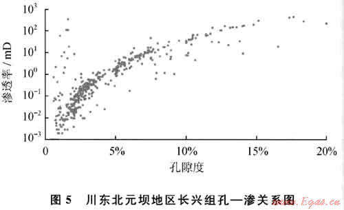 圖5表明,除局部滲透率受裂縫影響高于正常值外,總體上隨著孔隙度的增加,滲透率也隨之增大,儲(chǔ)層孔-滲相關(guān)性較好,元壩地區(qū)長(zhǎng)興組以孔隙型儲(chǔ)層為主,發(fā)育部分裂縫-孔隙型儲(chǔ)層,屬于中低孔隙度、中低滲透率儲(chǔ)層。