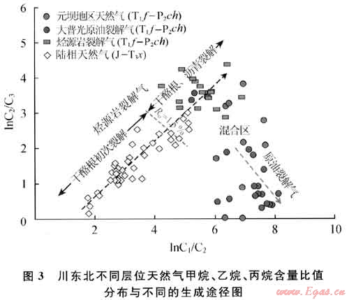 元壩氣田長(zhǎng)興組儲(chǔ)層中普遍見有固體瀝青,表明地史上形成過古油藏并發(fā)生了原油裂解作用。根據(jù)大普光和通南巴地區(qū)實(shí)際氣藏分析資料的綜合對(duì)比及模擬實(shí)驗(yàn)數(shù)據(jù)[10],發(fā)現(xiàn)這兩類天然氣在lnC1/C2、lnC2/C3比值分布上有明顯差別(圖3)。烴源巖裂解氣的lnC1/C2值較低,大多在6.0之下;而lnC2/C3值較高,均在2.5以上,并隨熱演化程度的增加而變大。原油裂解氣的lnC1/C2值較高,大都在6.0以上;lnC1/C2值較低,大多在2.0之下,與前類天然氣形成區(qū)別。如圖3所示,元壩地區(qū)的飛仙關(guān)-長(zhǎng)興組天然氣總體上呈高lnC1/C2、低lnC2/C3值的原油裂解氣組成特點(diǎn)。它們的lnC1/C2值基本上都在6.0以上,且多數(shù)氣樣lnC2/C3值低于2.5,由此可認(rèn)為主要來源于古油藏原油的裂解作用。同時(shí)在圖3中可觀察到,部分氣樣的lnC2/C3值高于2.5,近于烴源巖裂解氣的分布區(qū),意味著這些天然氣中部分氣源直接來自烴源巖。
