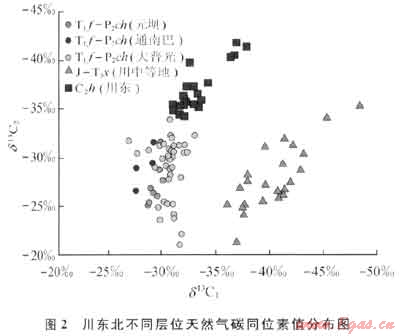 至于氣藏中那部分烴源巖裂解氣來自哪個(gè)層位的烴源巖,通過氣/巖碳同位素的對(duì)比尚存在一些不確定性。但在天然氣烷烴碳同位素的組成及化學(xué)成分上,本區(qū)飛仙關(guān)組、長(zhǎng)興組天然氣完全不同川東地區(qū)的石炭系(圖2),因此,來自志留系及以下地層的可能性較小,從烴源巖厚度和有機(jī)質(zhì)豐度上看,其主力氣源也應(yīng)為上二疊統(tǒng)龍?zhí)督M(吳家坪組)。