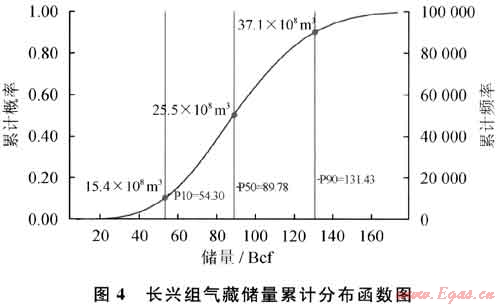 一旦確定代理方程,可以應(yīng)用蒙特卡洛模擬產(chǎn)生地質(zhì)儲(chǔ)量分布。對(duì)方程中的每個(gè)項(xiàng),確定其分布函數(shù)。通常來(lái)說(shuō),儲(chǔ)層頂部深度、孔隙度、孔隙度下限值、氣水界面為三角分布,相變界限為均勻分布[2]。圖4為最終得到七里北長(zhǎng)興組氣藏天然氣地質(zhì)儲(chǔ)量:P10=15.4×108m3;P50=25.5×108m3;P90=37.1×108m3。