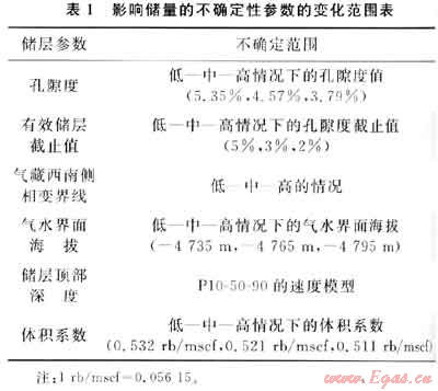 儲(chǔ)層孔隙度在±17%范圍內(nèi)變化。該變化范圍是根據(jù)本區(qū)所有開(kāi)發(fā)井的非儲(chǔ)層巖層孔隙度的變化范圍計(jì)算得來(lái)的。表1列出了不確定范圍的主要參數(shù)。