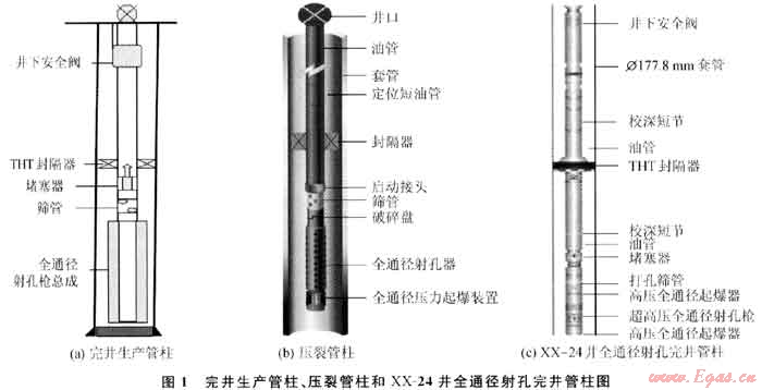 全通徑射孔[1~2]是采用油管將全通徑射孔器材及配套井下工具輸送到目的層位,起爆射孔后,將射孔器材的附件全部丟掉,整個(gè)管柱形成與油管直徑相當(dāng)?shù)耐◤?。它能夠?qū)崿F(xiàn)一次性完井管柱,保護(hù)氣藏免受二次污染;能夠與酸化、加砂壓裂等增產(chǎn)措施聯(lián)作,節(jié)省完井時(shí)間和鉆井費(fèi)用;能夠?yàn)楹罄m(xù)生產(chǎn)測(cè)井提供過(guò)儀器通道。