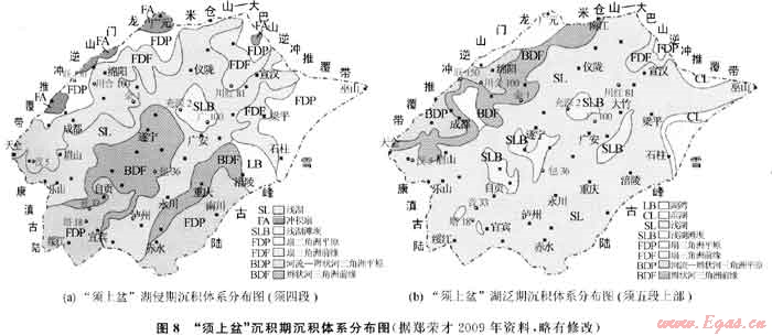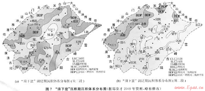2) 受“安縣運動”影響[22],沿造山帶前緣普遍發(fā)育有大規(guī)模的沖積扇-扇三角洲沉積體系,而川中前陸隆起帶和川東南坳陷帶仍為河流-辮狀河三角洲沉積體系的繼承性發(fā)育區(qū),圍繞前陸隆起帶的3個前緣坳陷中心區(qū)依然以發(fā)育湖泊沉積體系為主,從總體上看,“須上盆”繼承了“須下盆”構(gòu)造-沉積格局的基本特征。