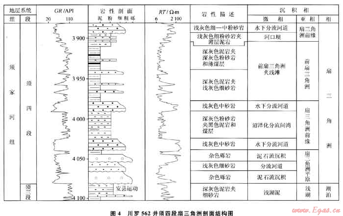 主要指與四川類前陸盆地構(gòu)造演化有關(guān)的沉積充填類型和序列,據(jù)已有研究成果[10~11],盆-山耦合過程中須家河組的沉積學(xué)響應(yīng)可粗分為以下2種基本情況:①強(qiáng)烈構(gòu)造活動期,對應(yīng)的沉積學(xué)響應(yīng)過程為粗碎屑巖占有很大比例的沖積扇(或扇三角洲)→辮狀河三角洲→湖泊沉積體系演化序列,發(fā)育粒度向上變細(xì)的退積層序;②構(gòu)造活動平靜期,對應(yīng)的沉積學(xué)響應(yīng)過程為含煤碎屑巖建造為特征的辮狀河三角洲→湖泊-沼澤沉積體系演化序列,在三角洲沉積區(qū),具粒度向上加粗變淺的加積→進(jìn)積層序,而在湖泊沉積區(qū),具向上變淺的沉積序列。