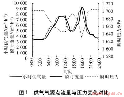 不同的城市在不同的階段會(huì)有不同的供氣方式,不同的供氣方式對小時(shí)調(diào)峰的敏感程度也有所不同。對于以CNG作為供氣氣源的城市,受供氣規(guī)模的限制,小時(shí)調(diào)峰問題比較明顯。我公司在管輸供氣之前由兩座CNG儲(chǔ)配站聯(lián)網(wǎng)向市區(qū)供氣,其中秀洲站為主供氣站,南湖站為輔助供氣站,主要在用氣高峰及秀洲站設(shè)備檢休時(shí)向管網(wǎng)供氣。從運(yùn)行情況來看,每天用氣高峰出現(xiàn)在晚上17時(shí)到19時(shí),用氣次高峰在上午10時(shí)到12時(shí)。秀洲站某一天的24h原始運(yùn)行數(shù)據(jù)見表1,表1中出站壓力、瞬時(shí)流量和累計(jì)供氣量均為CNG站調(diào)壓橇內(nèi)壓力表和流量計(jì)的讀數(shù),小時(shí)供氣量為從一個(gè)計(jì)算小時(shí)開始到下一個(gè)計(jì)算小時(shí)開始兩個(gè)時(shí)刻累計(jì)供氣量的差。從表1來看,由于受CNG供氣方式的影響,表1中CNG小時(shí)供氣量、瞬時(shí)流量和出站壓力之間沒有相關(guān)性,表1中數(shù)據(jù)不能反映用氣高峰的情況,但從沒有供氣情況下出站壓力的下降還是能看出管網(wǎng)儲(chǔ)氣用于給用戶供氣的調(diào)峰作用。