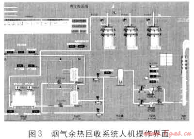 導(dǎo)熱油循環(huán)泵采用軟啟器啟動(dòng),手動(dòng)/自動(dòng)切換及導(dǎo)熱油循環(huán)泵切換均由上位機(jī)控制,當(dāng)發(fā)生故障時(shí)有故障報(bào)警燈報(bào)警。變頻高溫引風(fēng)機(jī)采用變頻/工頻手動(dòng)切換、手動(dòng)/自動(dòng)切換控制、故障報(bào)警。電加熱煅燒爐電動(dòng)煙氣閘板由上位機(jī)控制,現(xiàn)場(chǎng)設(shè)開閉控制器。煙氣余熱回收系統(tǒng)人機(jī)操作界面見圖3,煙氣余熱回收系統(tǒng)中所有溫度、壓力、流量、液位顯示及故障報(bào)警均在上位機(jī)人機(jī)操作界面中顯示。