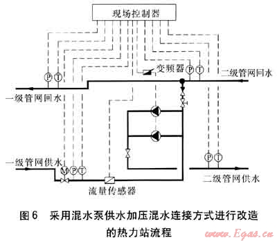 恒源熱力公司自2009年8月開始,對(duì)東北線熱網(wǎng)進(jìn)行混水連接、遠(yuǎn)程監(jiān)控技術(shù)改造。已將49座熱力站進(jìn)行整合改造成混水連接熱力站30座,建設(shè)監(jiān)控中心,對(duì)熱力首站和熱力站實(shí)施監(jiān)控。改造項(xiàng)目包括將原有熱力站水-水換熱器、補(bǔ)水泵等設(shè)備拆除,進(jìn)行站內(nèi)管道的改造,安裝自動(dòng)調(diào)節(jié)閥、現(xiàn)場(chǎng)控制器。2009年11月10日,所有改造工作全部完成,至11月30日全部調(diào)試完畢,正式投入運(yùn)行。改造主要考慮采用混水泵旁通加壓、混水泵供水加壓兩種連接方式。