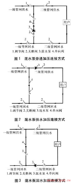 混水連接方式可分為混水泵旁通加壓、混水泵供水加壓、混水泵回水加壓連接方式[4],這3種連接方式分別見圖1~3。通過改變混水比調(diào)整二級(jí)管網(wǎng)供水溫度,從而改變一級(jí)管網(wǎng)回水溫度,滿足熱力首站二級(jí)側(cè)回水溫度的要求。