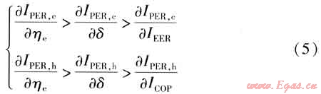 根據(jù)熱泵機(jī)組和燃?xì)鈾C(jī)的運(yùn)行特性可知:燃?xì)鈾C(jī)與壓縮機(jī)的傳動(dòng)效率ηi≈1,一般ηe<0.4,則1>1-ηe>ηe。由于δ<1,一般IEER、ICOP>2,因此IEER-δ>1,ICOP-δ>1。因此有: