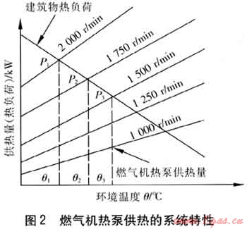燃?xì)鈾C(jī)熱泵供熱的系統(tǒng)特性見圖2,顯示了燃?xì)鈾C(jī)在不同轉(zhuǎn)速時(shí),熱泵能提供的供熱量與建筑物在不同環(huán)境溫度下所需熱負(fù)荷之間的關(guān)系。假設(shè)在滿足建筑物最大熱負(fù)荷(即壓縮機(jī)最大負(fù)荷,P1點(diǎn))條件下確定傳動(dòng)比,此時(shí)燃?xì)鈾C(jī)具有最好的經(jīng)濟(jì)性,即燃?xì)鈾C(jī)工作在經(jīng)濟(jì)轉(zhuǎn)速區(qū)間內(nèi),熱泵的其他工作狀態(tài)點(diǎn)(P2,P3等點(diǎn))也都唯一確定。而實(shí)際E燃?xì)鈾C(jī)熱泵大部分時(shí)間都處于部分負(fù)荷運(yùn)行狀態(tài),最大負(fù)荷運(yùn)行時(shí)間不超過總運(yùn)行時(shí)間的10%。因此當(dāng)機(jī)組處于部分負(fù)荷運(yùn)行狀態(tài)時(shí),以最大負(fù)荷工況確定的傳動(dòng)比將使燃?xì)鈾C(jī)低效率運(yùn)行,燃料消耗量大,全年運(yùn)行經(jīng)濟(jì)性差。因此單級(jí)傳動(dòng)比是以犧牲燃?xì)鈾C(jī)的經(jīng)濟(jì)性為代價(jià)來滿足壓縮機(jī)的動(dòng)力性要求,且當(dāng)建筑物熱負(fù)荷變化范圍較大時(shí),燃?xì)鈾C(jī)在低速、低負(fù)荷狀態(tài)下工作時(shí),可能會(huì)出現(xiàn)燃?xì)鈾C(jī)效率過低的問題。因此,這種方案并不理想。