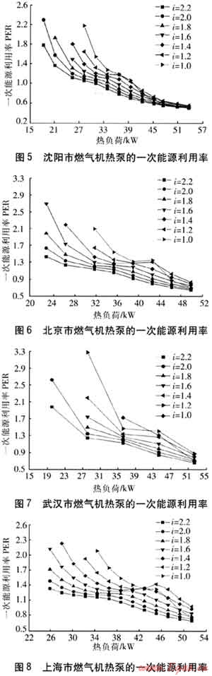 由圖5~8可知:①在供暖季節(jié)使用燃?xì)鈾C(jī)熱泵,若采用單級(jí)傳動(dòng)比,則高傳動(dòng)比時(shí)的一次能源利用率比較低。即傳動(dòng)比越大,燃?xì)鈾C(jī)熱泵的運(yùn)行越不經(jīng)濟(jì)。②相同傳動(dòng)比的燃?xì)鈾C(jī)熱泵,其一次能源利用率隨緯度的升高而降低。③熱負(fù)荷較小時(shí),低傳動(dòng)比燃?xì)鈾C(jī)的輸出功率無法滿足壓縮機(jī)的功率需求,此時(shí)燃?xì)鈾C(jī)會(huì)熄火甚至無法啟動(dòng)。只有通過增大燃?xì)鈾C(jī)的節(jié)氣門開度,提高燃?xì)鈾C(jī)的轉(zhuǎn)速來滿足需要的熱負(fù)荷,但此時(shí)燃?xì)鈾C(jī)已處于高速低效工作區(qū),機(jī)組的經(jīng)濟(jì)性較差。④當(dāng)熱負(fù)荷較小時(shí),燃?xì)鈾C(jī)熱泵的一次能源利用率較高,原因是:a.工作環(huán)境改善使熱泵的供熱系數(shù)比較高;b.當(dāng)熱負(fù)荷較小、燃?xì)鈾C(jī)轉(zhuǎn)速較低時(shí),供熱量中回收的燃?xì)鈾C(jī)余熱比例較大;c.當(dāng)熱負(fù)荷最大時(shí),燃?xì)鈾C(jī)熱泵在4個(gè)城市中的一次能源利用率都比較低,約為0.6~0.8,但這種惡劣極端天氣的時(shí)間在供暖期中所占的比例很小。d.在熱負(fù)荷為30~40kW(供暖時(shí)間比較集中)時(shí),采用不同單級(jí)傳動(dòng)比的燃?xì)鈾C(jī)熱泵,其一次能源利用率較高,基本都大于1.2。