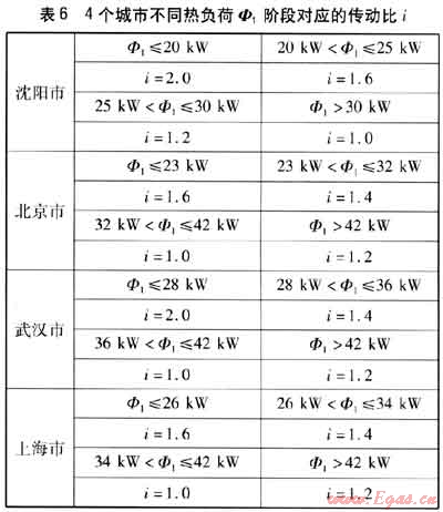 遵循多級(jí)傳動(dòng)比的確定原則,結(jié)合單級(jí)傳動(dòng)比的計(jì)算結(jié)果,針對(duì)4個(gè)城市的不同熱負(fù)荷階段,確定了采用多級(jí)傳動(dòng)比的燃?xì)鈾C(jī)熱泵的不同傳動(dòng)比i(即檔位),見表6。