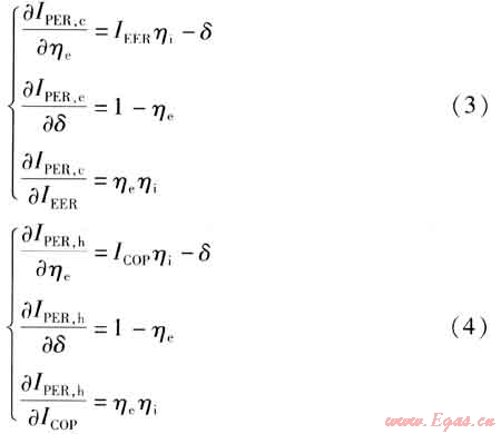 由式(1)、(2)可知,燃?xì)鈾C(jī)熱泵的一次能源利用率與熱泵的性能系數(shù)、燃?xì)鈾C(jī)的熱效率及余熱回收系數(shù)有關(guān),各因素對(duì)PER的影響程度不同。IPER,c、IPER,h分別對(duì)ηe、IEER或ICOP求偏導(dǎo),得: