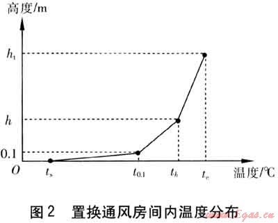 在分析置換通風(fēng)房間溫度控制時(shí),設(shè)定室內(nèi)溫度在垂直方向上具有線性變化規(guī)律。距地面0.1m處是人體腳踝的位置,腳踝是人體暴露于空氣中的敏感部位,因此該高度的空氣溫度t0.1不應(yīng)引起人體的不適。從舒適度出發(fā),設(shè)計(jì)人員往往關(guān)心的是人員頭部與腳踝之間的溫差。采用置換通風(fēng)時(shí),室內(nèi)溫度變化由3部分組成: