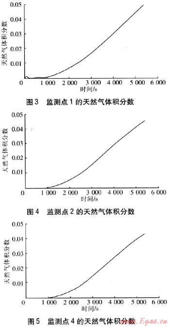 監(jiān)測點(diǎn)1、2、4的模擬結(jié)果見圖3~5,監(jiān)測點(diǎn)3、5、6、7的天然氣體積分?jǐn)?shù)曲線與圖4、5相似。