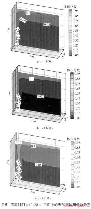 模擬了天然氣泄漏后,x=1.35m平面、z=1m(距離地面1m)平面、z=1.6m平面上的天然氣體積分?jǐn)?shù)隨時間t的變化規(guī)律。天然氣泄漏1800、3600、5400s后x=1.35m平面上的天然氣體積分?jǐn)?shù)分布見圖6。由模擬結(jié)果可知,天然氣泄漏擴(kuò)散后的體積分?jǐn)?shù)隨與地面垂直距離的增大而增大。不同時刻天然氣泄漏擴(kuò)散的形態(tài)基本相似,但天然氣的體積分?jǐn)?shù)和所覆蓋的危險區(qū)域變化較大。