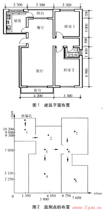 以該二室一廳建筑內(nèi)的廚房天然氣泄漏為例,建筑平面布置見圖1,尺寸單位為mm,房間高3.3m。按照該建筑建立物理模型,天然氣泄漏點(diǎn)設(shè)定在廚房地表面,在室內(nèi)設(shè)置7個監(jiān)測點(diǎn),監(jiān)測點(diǎn)的布置見圖2,監(jiān)測點(diǎn)距地面1.6m,圖2中的箭頭表示天然氣泄漏后的擴(kuò)散方向。設(shè)室內(nèi)環(huán)境溫度為27℃,壓力為一個標(biāo)準(zhǔn)大氣壓,墻壁為絕熱,房間處于封閉狀態(tài)。假定天然氣泄漏孔的直徑為25mm,泄漏速度為3m/s。