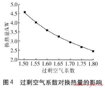 過(guò)??諝庀禂?shù)改變會(huì)影響煙氣進(jìn)口溫度[2],也會(huì)引起煙氣流量變化,使煙氣側(cè)換熱效果發(fā)生變化[3]。保持其他參數(shù)不變,過(guò)剩空氣系數(shù)從1.5增至1.8。根據(jù)燃燒后煙氣總焓不變的原則,計(jì)算出不同過(guò)剩空氣系數(shù)下的煙氣溫度和煙氣流量,代入單管模型進(jìn)行計(jì)算,計(jì)算的換熱量見(jiàn)圖4。過(guò)??諝庀禂?shù)每下降0.1,換熱量可增大20%左右。過(guò)??諝庀禂?shù)增大時(shí),煙氣流量雖然增加,但因燃燒溫度降低使煙氣流速減小,hf減小,使傳熱量減小。故應(yīng)在保證污染物排放不超標(biāo)的前提下,盡量減小過(guò)剩空氣系數(shù)。