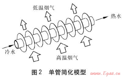 為簡(jiǎn)化,將換熱器中嵌布的水管視作末端絕熱的肋片管,水管由若干(5或6)根肋片管依次串聯(lián)而成,肋片視作直管上的等截面環(huán)肋。高溫?zé)煔鈾M掠肋片管,將熱量傳遞給水管中流動(dòng)的冷水。單管簡(jiǎn)化模型見(jiàn)圖2。在相同的燃?xì)夂牧亢退髁肯?,水?cè)溫升較大,則認(rèn)為換熱效率較高,故可用出口水溫來(lái)衡量肋片管的換熱效率。本研究中比定壓熱容均取相應(yīng)溫度范圍內(nèi)的平均值。