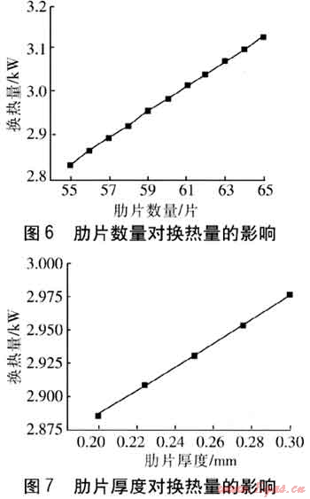肋片厚度會(huì)影響肋片效率,也影響煙氣通道的面積,改變煙氣流速,進(jìn)而改變換熱量。當(dāng)肋片厚度增加時(shí),肋片效率ηf增大,從而使煙氣側(cè)表面?zhèn)鳠嵯禂?shù)增大,換熱器的換熱效果增強(qiáng)。當(dāng)肋片厚度從0.2mm變化至0.3m時(shí),換熱量的改變見(jiàn)圖7。肋片厚度增加0.1mm,換熱量增加3%。
