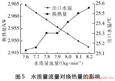 水質(zhì)量流量變化會(huì)引起水的流速變化,影響水側(cè)的傳熱系數(shù),也影響水與煙氣的換熱時(shí)間[4]。保持其他參數(shù)不變,水質(zhì)量流量從7.6kg/min變化到8.2kg/min,換熱量與出口水溫的變化見(jiàn)圖5。由圖5可知,水質(zhì)量流量增大,雖然出水溫度有所下降,但總的換熱量是增加的,換熱器換熱效率提高。可以考慮調(diào)節(jié)燃?xì)饬髁颗c調(diào)節(jié)水質(zhì)量流量相結(jié)合來(lái)進(jìn)行燃?xì)鉄崴鞯乃疁乜刂?,提升水溫小幅變化時(shí)熱水器的換熱效率。
