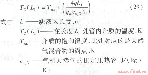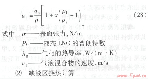 由于LNG是多元組分混合物,而混合物的沸騰換熱很復雜,因而是較難處理的,目前對二元混合物有一些沸騰傳熱系數(shù)的計算公式,但其中均含有與特定二元物質(zhì)組合有關的實驗系數(shù),其流動換熱關系式不能直接應用于本課題的LNG介質(zhì)。因此,本文在進行兩相區(qū)的換熱計算時,采用簡化假設。由于LNG中甲烷的摩爾分數(shù)高達90%以上,故將此區(qū)的LNG看作甲烷。將兩相區(qū)分為流動沸騰區(qū)和缺液區(qū),在流動沸騰區(qū)溫度保持泡點不變,在缺液區(qū)溫度由泡點升高至露點。
