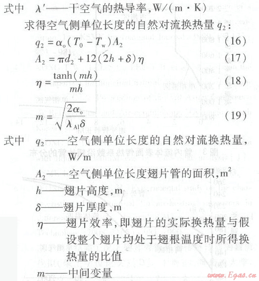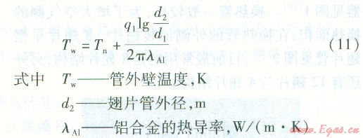 利用通過圓筒壁的導熱公式,計算沒有翅片部分管外壁的溫度ΤW,此溫度即為翅片的根部溫度。