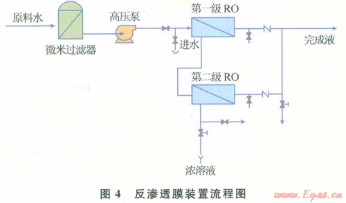 反滲透脫鹽裝置主要由過濾設(shè)備、加壓泵和反滲透膜裝置(中空纖維式或卷式的膜分離設(shè)備)組成。反滲透膜裝置流程如圖4所示。反滲透膜能截留水中的各種無機(jī)離子、膠體物質(zhì)和大分子溶質(zhì),從而取得凈化的水。反滲透膜的材料和規(guī)模根據(jù)煤層氣產(chǎn)出水水質(zhì)、運(yùn)輸方式和預(yù)處理方式的差異而有所不同。為了提高反滲透膜的脫鹽效率和使用壽命,必須對原料水進(jìn)行過濾等預(yù)處理。反滲透膜脫鹽率高,受pH值、溫度等因素影響較小,制膜原料來源廣、加工簡便、成本低廉,在澳大利亞煤層氣工業(yè)中有著廣泛的應(yīng)用。其缺點在于對采出水的水質(zhì)要求較高,預(yù)處理過程復(fù)雜[3-4]。