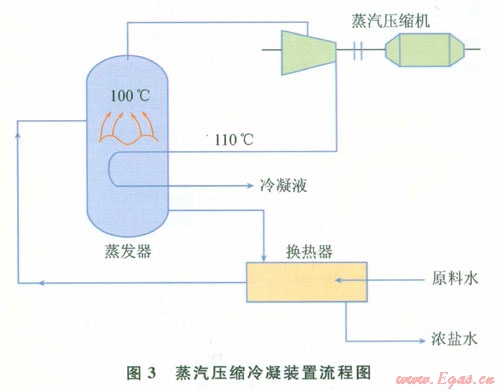 蒸汽壓縮冷凝脫鹽技術(shù)是將鹽水預(yù)熱后,引入蒸發(fā)器并使之在蒸發(fā)器內(nèi)部分蒸發(fā)。蒸汽壓縮冷凝裝置流程如圖3所示,流程所產(chǎn)生的二次蒸汽經(jīng)壓縮機(jī)壓縮提高壓力后引入到蒸發(fā)器的加熱側(cè),蒸汽冷凝后作為完成液引出,如此實現(xiàn)熱能的循環(huán)利用。蒸汽壓縮冷凝方法可使冷卻水中的有害成分得到濃縮排放,并使冷凝液作為循環(huán)水和鍋爐補(bǔ)充水返回系統(tǒng),同時將低能量的蒸汽轉(zhuǎn)化為高能量的蒸汽用于后面裝置的加熱。單個蒸汽壓縮裝置的處理能力為250~3 000m3/d。
