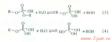 有機(jī)酯的水解反應(yīng)為酰基碳上的親核取代,羧酸酯水解反應(yīng)方程式為式(1)[11],產(chǎn)物為羧酸和飽和醇;磷酸酯水解反應(yīng)方程式為式(2)~(4),產(chǎn)物為磷酸和飽和醇??梢?,有機(jī)酯水解后產(chǎn)物為有機(jī)酸和醇類物質(zhì)。由于有機(jī)酸為酸化常用體系,有助于酸化,同時醇類物質(zhì)具有較好的潤濕延展性,能降低表面張力。因此,有機(jī)酯不僅不會對儲層造成傷害,其水解產(chǎn)物有機(jī)酸還能起到一定的酸化效果,醇類還能解除水鎖現(xiàn)象。
