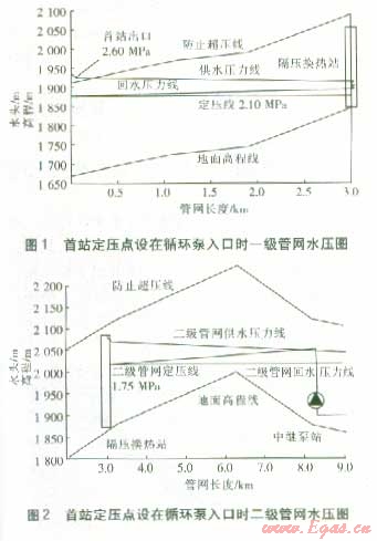 電廠和市區(qū)分別處于山的兩端,首站位于電廠內(nèi),由于系統(tǒng)高差較大,需設(shè)隔壓換熱站l座。從電廠到隔壓換熱站為一級(jí)管網(wǎng),設(shè)計(jì)壓力為2.5 MPa.設(shè)計(jì)供/回水溫度為130/70℃。從隔壓換熱站到小區(qū)熱力站為二級(jí)管網(wǎng),設(shè)計(jì)壓力為2.5 MPa,設(shè)計(jì)供/回水溫度l20/60℃。從熱力站到用戶為三級(jí)管網(wǎng),設(shè)計(jì)壓力為1.0 MPa,設(shè)計(jì)供/回水溫度80/55℃。首站海拔為1 669 m,小區(qū)熱力站(位于市區(qū)內(nèi))海拔約1 850 m,系統(tǒng)最高海拔在二級(jí)管網(wǎng)部分,為2 010 m。隔壓換熱站設(shè)在海拔為1 850 m處,距離電廠約3 km,比電廠高181 m。130℃水汽化壓頭為l7.6 m,考慮隔壓換熱站換熱器布置在二層,設(shè)備充水高度為6 m,同時(shí)考慮5 m水柱安全余量,一級(jí)管網(wǎng)定壓壓頭210 m,即壓力為2.10 MPa,定壓點(diǎn)設(shè)在首站。