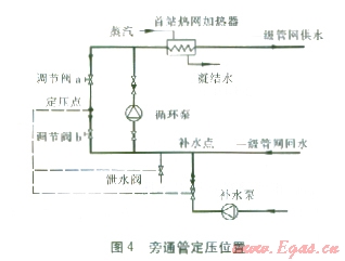 旁通管定壓是把定壓點(diǎn)設(shè)在旁通處的定壓方式。與其他定壓方式不同,旁通管定壓不僅有定壓作用,也有調(diào)壓功能。旁通管定壓系統(tǒng)具有獨(dú)到的優(yōu)點(diǎn):首先造價(jià)低,只需在循環(huán)泵兩側(cè)或供回水總管上安裝旁通管及調(diào)節(jié)閥,并保證定壓點(diǎn)與補(bǔ)水泵、泄水閥連鎖。其次運(yùn)行費(fèi)用省,與在循環(huán)泵人口補(bǔ)水定壓相比,旁通管定壓補(bǔ)水點(diǎn)的壓力較小,補(bǔ)水泵工作揚(yáng)程減小,節(jié)省了運(yùn)行費(fèi)用。再次,系統(tǒng)安全可靠,通過(guò)旁通管調(diào)壓,系統(tǒng)的動(dòng)壓線大大降低,即運(yùn)行壓力大大降低,管網(wǎng)與用戶承壓減小,運(yùn)行更安全。旁通管定壓在一級(jí)管網(wǎng)和二級(jí)管網(wǎng)中均可使用。