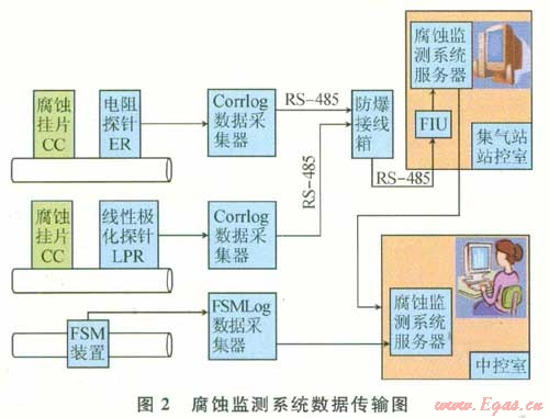 2)普光集輸管網(wǎng)采用FSM腐蝕監(jiān)測(cè)系統(tǒng),共有19套,包括FSM測(cè)量裝置、FSMLog數(shù)據(jù)采集器等。FSM測(cè)量裝置安裝于管道外壁,F(xiàn)SMLog數(shù)據(jù)采集器(含F(xiàn)IU服務(wù)器)安裝于閥室機(jī)柜問或站控室,數(shù)據(jù)通過工業(yè)以太網(wǎng)上傳至中控室腐蝕監(jiān)測(cè)系統(tǒng)服務(wù)器。中控室值班人員可在中控室的腐蝕監(jiān)測(cè)系統(tǒng)上實(shí)時(shí)在線了解整個(gè)全氣田16座集氣站(集氣總站)及管網(wǎng)各測(cè)點(diǎn)的腐蝕情況,通過分析測(cè)試,及時(shí)調(diào)整緩蝕劑的批處理頻次及對(duì)批處理效果的評(píng)價(jià)。