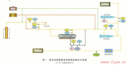 針對(duì)普光氣田地面集輸工藝及各種監(jiān)測(cè)技術(shù)的特點(diǎn),在集氣站和集氣總站設(shè)置水分析取樣點(diǎn),采用腐蝕掛片法(CC)、電阻探針法(ER)、線性極化探針法(LPR)、定期進(jìn)行鐵離子分析等方法,在集輸管網(wǎng)的線路管道上采用FSM電指紋方法進(jìn)行腐蝕監(jiān)測(cè)。