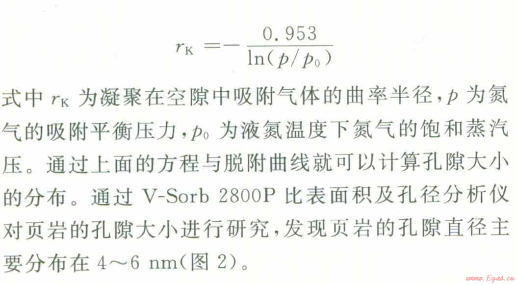 孔隙按大小可分為大孔(直徑大于50 nm),介孔(直徑介于2~50 rim)、微孑L(直徑小于2 nm)。利用氣體在頁巖孑L隙中的吸附與解吸可以測量其孔隙大小及其分布情況,當壓力低于氣體的臨界壓力時,對于介孔與大孔,首先發(fā)生多層吸附,相對壓力更高時,則發(fā)牛毛細管凝聚,形成類似液體的彎液面。介孔孔徑分布一般用Kelvin方程進行計算。以氮氣作為吸附氣體時,當液氮溫度為77 K時,Kelvin方程可表述如下: