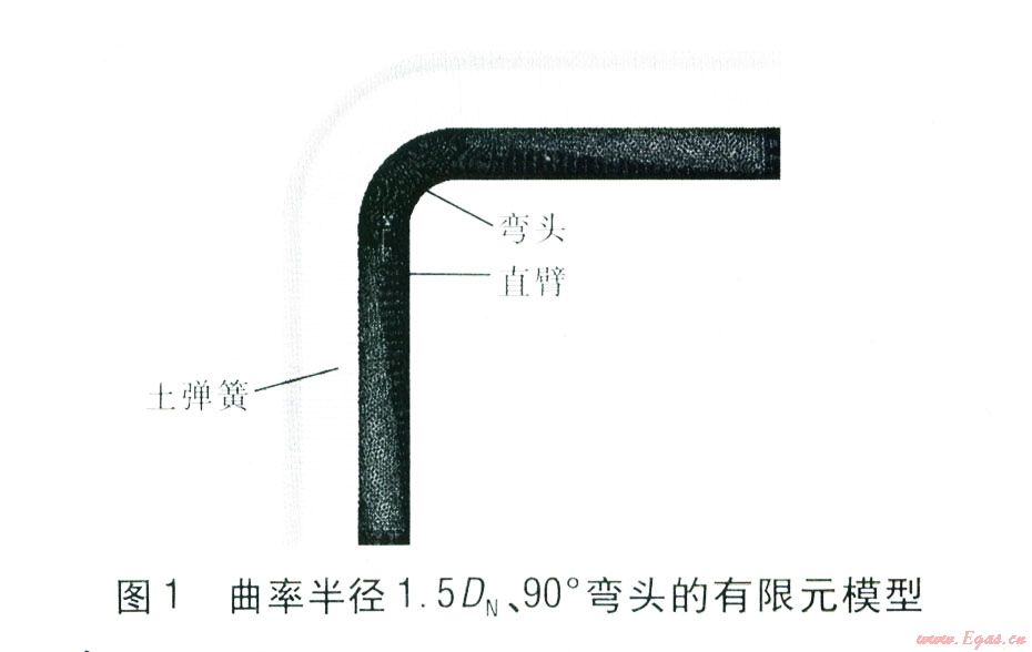 在Pro/Engineer軟件中建立橢圓彎頭模型,并通過數(shù)據(jù)無縫連接的方法將模型導(dǎo)入ANSYS軟件中。在ANSYS軟件中對彎頭進(jìn)行網(wǎng)格劃分,并施加彈簧一阻尼器單元,然后設(shè)置彎頭和土彈簧的參數(shù),再施加荷載進(jìn)行求解。對彎頭的應(yīng)力有限元求解采用第四強(qiáng)度理論(形狀改變比能理論),第四強(qiáng)度理論認(rèn)為形狀改變比能是引起材料屈服破壞的主要因素,無論何種應(yīng)力狀態(tài),只要構(gòu)件內(nèi)一點處的形狀改變比能達(dá)到單向應(yīng)力狀態(tài)下的極限,材料就要發(fā)生屈服破壞。由米塞斯(Mises)公式[8]65計算當(dāng)量應(yīng)力。考慮到彎頭兩端直臂過長易降低軟件的運(yùn)算速度,因此建模時彎頭兩端直臂長度只取5 m,熱伸長量均由位移荷載代替,將位移荷載施加到直臂兩端面上。采用20節(jié)點的Solid95實體單元劃分彎頭與直臂,彈簧-阻尼器單元COMBINl4用于模擬管-土相互作用下的土彈簧[10],對彎頭和直臂全部采用自由劃分后形成的網(wǎng)格方式[10]。曲率半徑1.5DN(DN為公稱直徑)、90。彎頭的有限元模型見圖1。