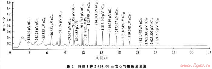 在2423.37~2428.11m井段鉆井取心,獲熒光級巖心2.38m,巖心出筒時新鮮斷面具芳烴氣味,噴照熒光5%,淡黃色,弱發(fā)光,系列對比7級,乳白色,巖心斷面具弱水濕感,滴水?dāng)U散,浸水試驗局部冒氣,呈串珠狀。氣測全烴由0.779 2%↑98.5637%,組分出至nC5,氣測正規(guī)化圖版解釋為氣層(圖1-a),氣測形態(tài)法解釋為氣層或油層(圖1-b)。熱解氣相色譜(圖2)氣態(tài)聯(lián)合峰(C8~C12)明顯,正構(gòu)烷烴組分分布較完整,基線較平直,呈規(guī)則梳狀,碳數(shù)范圍為nC11~nC30,其中輕組分占優(yōu)勢,主峰碳數(shù)為nC14~nC16,∑nC21-/∑nC22+介于4.24~17.65,總峰面積介于14041~28786μV·s,含烴量較大,反映出氣層特征。