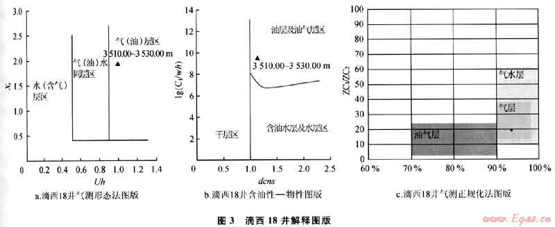 錄井綜合氣測解釋評價、常規(guī)地質(zhì)資料判斷地層不含水,解釋為氣層。后在井段3510.00~3530.O0m試油,日產(chǎn)油26.93t,氣25.006×104m3,試油結(jié)論為氣層。