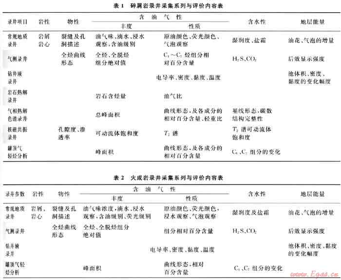 根據(jù)準噶爾盆地已發(fā)現(xiàn)的碎屑巖和火山巖天然氣藏儲層特性,分別建立了天然氣勘探的錄井采集系列與評價內(nèi)容(表1、2)。