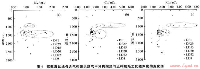 同水溶相天然氣“甲烷化”的原理一樣,由于異構(gòu)烷烴的溶解度大于正構(gòu)烷烴[6],水溶氣出溶后異構(gòu)烷與正構(gòu)烷的比值增加。從研究區(qū)煤系熱成因氣樣品異構(gòu)烷烴與正構(gòu)烷烴比值隨深度的變化規(guī)律可以看出(圖4):隨著深度的變淺,iC4/nC4、iC5/nC5和iC6/nC6都具有較明顯地增加趨勢(shì),在1500~2000m深度處若干比值出現(xiàn)異常的增大。結(jié)合本區(qū)實(shí)際地質(zhì)情況,在1500~2000m深度正是本區(qū)由超壓帶向常壓帶過渡的區(qū)域,因此認(rèn)為由于在該深度溫度、壓力的急劇降低導(dǎo)致天然氣在水中的溶解度降低,水溶相天然氣達(dá)到過飽和而出溶,從而使得出溶的天然氣異構(gòu)烷烴異常富集。