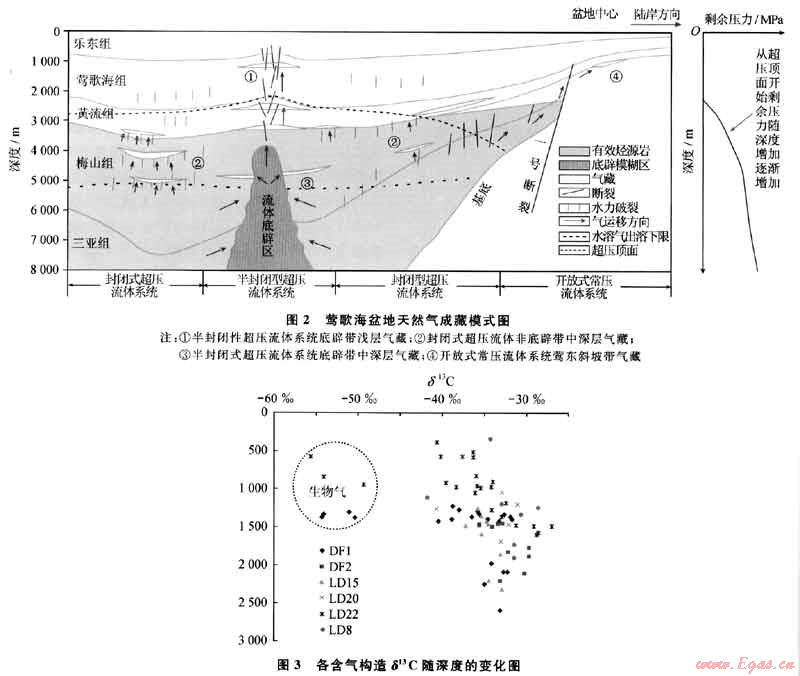 在中中新世以泥底辟為主的演化階段,地層超壓是盆地區(qū)域上壓實(shí)不均衡和三亞組大量生烴所導(dǎo)致,天然氣的有利充注部位為位于壓力過渡帶和常壓帶的中中新世背斜構(gòu)造。在晚中新世-第四紀(jì)以熱流體底辟為主的演化階段,盆地超壓體系的形成是不均衡壓實(shí)、三亞組生成的無機(jī)C02以及梅山組大量生烴所導(dǎo)致,天然氣的有利充注部位為位于壓力過渡帶和常壓帶的上新世鶯歌海組背斜構(gòu)造。