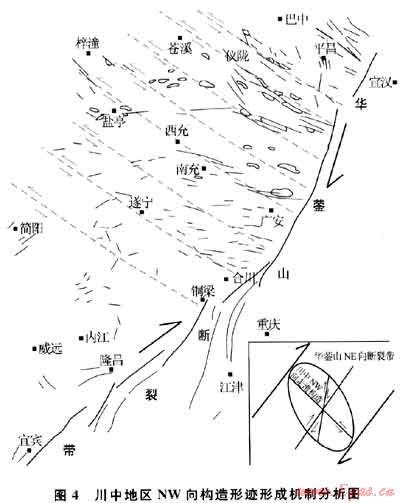 值得指出,川中地區(qū)上述兩種類型的NW向構造形跡是疊加在NE向構造背景上,其形成時間應是燕山晚期-喜馬拉雅期。