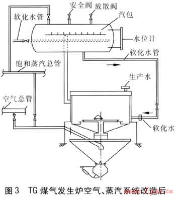飽和溫度波動(dòng)大的原因,除了工藝設(shè)備的因素外,還有人為控制因素。因此,既要從工藝設(shè)備的改造方面入手,還要考慮消除人為因素。我們?cè)诓环穸═G爐本身優(yōu)點(diǎn)的前提下,認(rèn)真分析了該廠原有3Aд-21煤氣發(fā)生爐爐況較易控制,并能長(zhǎng)期穩(wěn)定運(yùn)行的原因[3~6]。認(rèn)為3Aд-21煤氣發(fā)生爐的優(yōu)點(diǎn)除了破渣能力較強(qiáng)的爐條外,其水套產(chǎn)生的飽和蒸汽經(jīng)汽包收集后再根據(jù)需要由飽和溫度調(diào)節(jié)閥控制使用的方法,值得借鑒。這也是從根本上解決TG爐飽和溫度波動(dòng)大的行之有效的方法。為此,我們?cè)谏仃P(guān)冶煉廠TG爐中選一臺(tái)爐做試驗(yàn)。將TG爐的全水套在原結(jié)構(gòu)基礎(chǔ)上加寬100mm(總寬度達(dá)到200mm),并將水套分成爐頂水套和爐身水套,爐頂水套使用一般生產(chǎn)管網(wǎng)用水,只作為降低操作面溫度、改善工人的操作環(huán)境之用,爐身水套則使用軟化水,產(chǎn)生的飽和蒸汽收集到新設(shè)置的汽包。飽和蒸汽經(jīng)汽包的汽水分離器分離水分后,再按爐況需要控制送入空氣管充分混合供氣化之用(見圖3)。另外,將控制加料過程的溫度信號(hào)取自TG爐煤氣出口溫度。采取上述改造方案后效果非常好,TG爐工藝控制變得簡(jiǎn)單穩(wěn)定,我們很快就將其他的8臺(tái)TG爐全部按此方法改造。