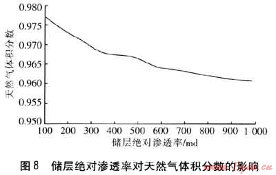 回采到第145天時(shí),儲(chǔ)層絕對滲透率對采出氣中天然氣體積分?jǐn)?shù)的影響見圖8。由圖8可知,回采相同時(shí)間時(shí),儲(chǔ)層絕對滲透率越大,采出氣中天然氣的體積分?jǐn)?shù)越小。因?yàn)閮?chǔ)層絕對滲透率越大,地層的水力傳導(dǎo)性越好,氮?dú)馀c天然氣的擴(kuò)散越容易,混合程度越大。