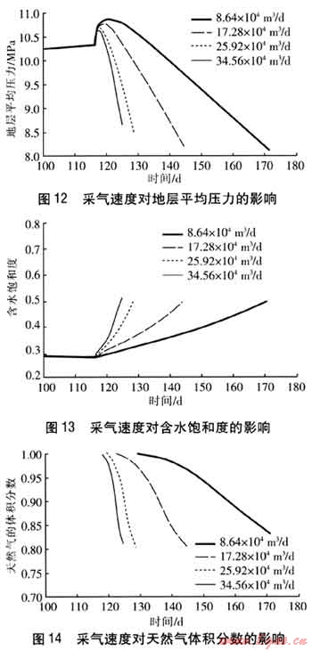 在目標(biāo)注氣量及注氣速度相同條件下,不同的采氣速度對儲(chǔ)氣庫運(yùn)行也有很大的影響(見圖12~15)。由圖12~15可知,采氣速度越快,地層平均壓力下降越快,注采井含水飽和度上升越快,天然氣與氮?dú)饣旌纤俣纫苍娇臁2蓺馑俣仍娇?,所需的墊層氣量越多,儲(chǔ)氣庫的回采率越低,而有時(shí)為了滿足調(diào)峰需要,可能需要較大的采氣速度。因此,必須綜合考慮各種因素,確定合理的采氣速度,保證調(diào)峰及采出氣體的質(zhì)量。