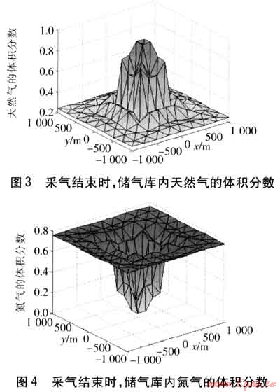 注氣結(jié)束后,關(guān)井穩(wěn)定20d,以使儲(chǔ)氣庫內(nèi)各點(diǎn)的壓力基本達(dá)到平衡狀態(tài),穩(wěn)定之后進(jìn)行回采。由于氣體相互擴(kuò)散,兩種氣體的混合帶逐漸變寬,隨著注采井壓力的下降,水會(huì)逐漸侵入。運(yùn)行到第184天時(shí),注采井的含水飽和度超過0.5,認(rèn)為對回采不利,此時(shí)停止采氣,儲(chǔ)氣庫內(nèi)天然氣及氮?dú)獾捏w積分?jǐn)?shù)見圖3、4。