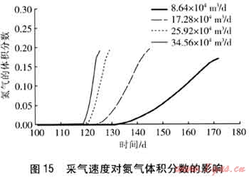 在初始建庫過程中,首先需要向儲(chǔ)氣庫中注入一定量的氮?dú)?,氮?dú)獾亩嗌賹Σ沙鰵庵械獨(dú)夂坑泻艽笥绊憽<俣▋?chǔ)氣庫總儲(chǔ)氣量仍為0.1×108m3,注采速度為8.64×104m3/d。要達(dá)到目標(biāo)注氣量,在注氣速度相同的情況下,需要注入116d。由于我們更關(guān)心采出氣的質(zhì)量,在此以回采到第165天為例,分析注入不同氮?dú)饬繒r(shí)采出氣的質(zhì)量,從而確定氣體的混合程度。